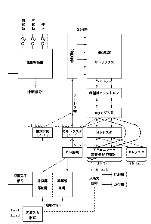 PC-1ではいま演算回路でn番地の命令In (数値〔mn〕) を実行しているとするとmpレジスターには次の命令In+1が読み出されて待っていて, 番地計数器には次の次の命令の番地n+2が出来て待っている. Inが完了すると同時に次の命令に使用する数値〔mn+1〕を読んで直ちに命令In+1の計算を開始し, In+1を実行している間に次の命令In+2をmpレジスターに用意し, 番地計数器はn+3になる. この制御法により, 加減算, 論理演算等の速い命令はパラメトロンの4変調周期(これを4τと表す)で実行可能となった. この方法は, アキュムレータの内容を記憶装置に入れる記憶命令は, これがその直後の命令を変更する場合にだけ不都合を生ずるが, 原理的にはこの特別な場合を検出して, 訂正を行う同時制御も可能である. しかしPC-1では回路を簡易化する為に記憶命令の場合には記憶が終ってから次の命令を読むようにした. この為8τを要する. この同時制御法の採用により, 乗除算以外の"速い"命令は, これを採用しない場合よりも2乃至3倍速くなったと思われるが一方これを行う為に 増加したパラメトロンの個数は200個位であって全体の個数の5%に満たないのである. PC-2ではこの同時制御を更に高度化し, 演算装置で乗, 除, 開平, 浮動小数点演算の様に時間のかかる命令を実行している間にアドレス変更用Bレジスターを利用しプログラムの反復回数, サブルーチンの呼出し等の操作を独立に実行させる予定であり, この為には, PC-1のmpレジスターに相当する待合せ用レジスターを少くとも2組設ける必要がある.