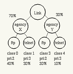 The test configuration is similar to the two agency setting used by Floyd [6]. The class hierarchy is defined as shown in Figure 12 where two agencies share the link, and interactive and non-interactive leaf classes share the bandwidth of each agency. In the measurements, Agency X is emulated by host B and agency Y is emulated by host A.